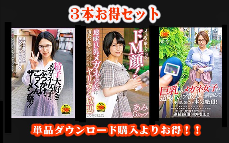【お得セット】精子大好きメガネ女子にぶっかけ、ごっくん、ザーメン祭!!・イジめて欲しいとねだるドM顔!・巨乳のメガネ女子が遠隔バイブ散歩に興奮して生中出しSEXで本気絶頂!|品番453639│アポロ/妄想族(お得セット)